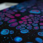 Dominantes Schwarz, durchdrungen von leuchtenden Zellen in Magenta, Violett, Karminrot und Hellblau.